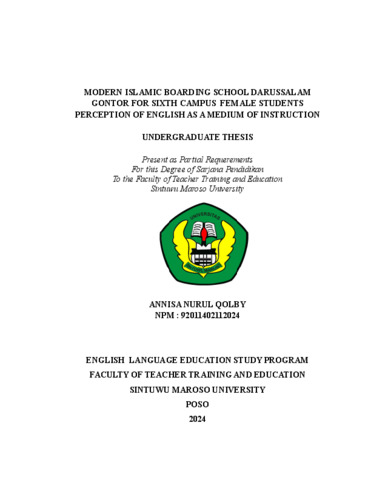 Qolby, Annisa Nurul (2024) MODERN ISLAMIC BOARDING SCHOOL DARUSSALAM GONTOR FOR SIXTH CAMPUS FEMALE STUDENTS PERCEPTION OF ENGLISH AS A MEDIUM OF INSTRUCTION. Undergraduate thesis, UNIVERSITAS SINTUWU MAROSO.